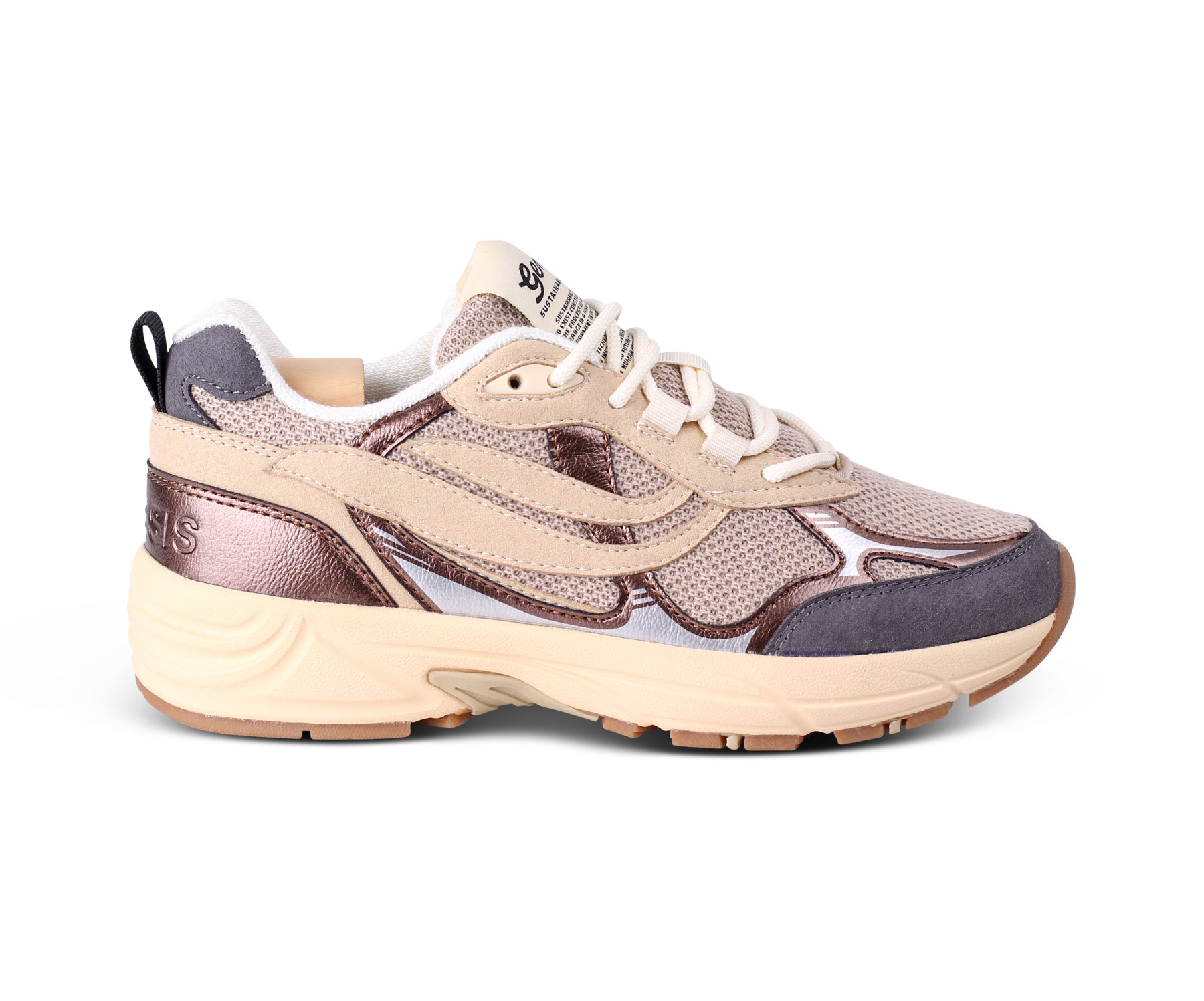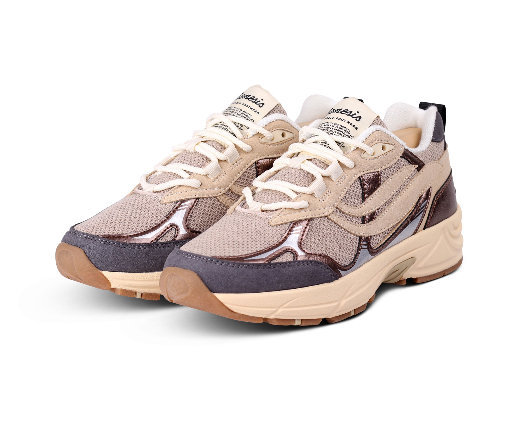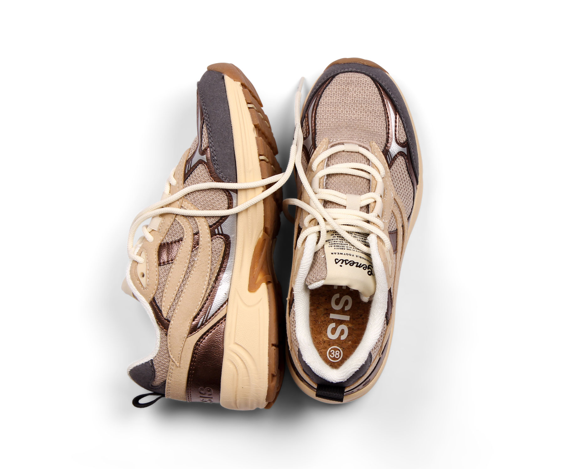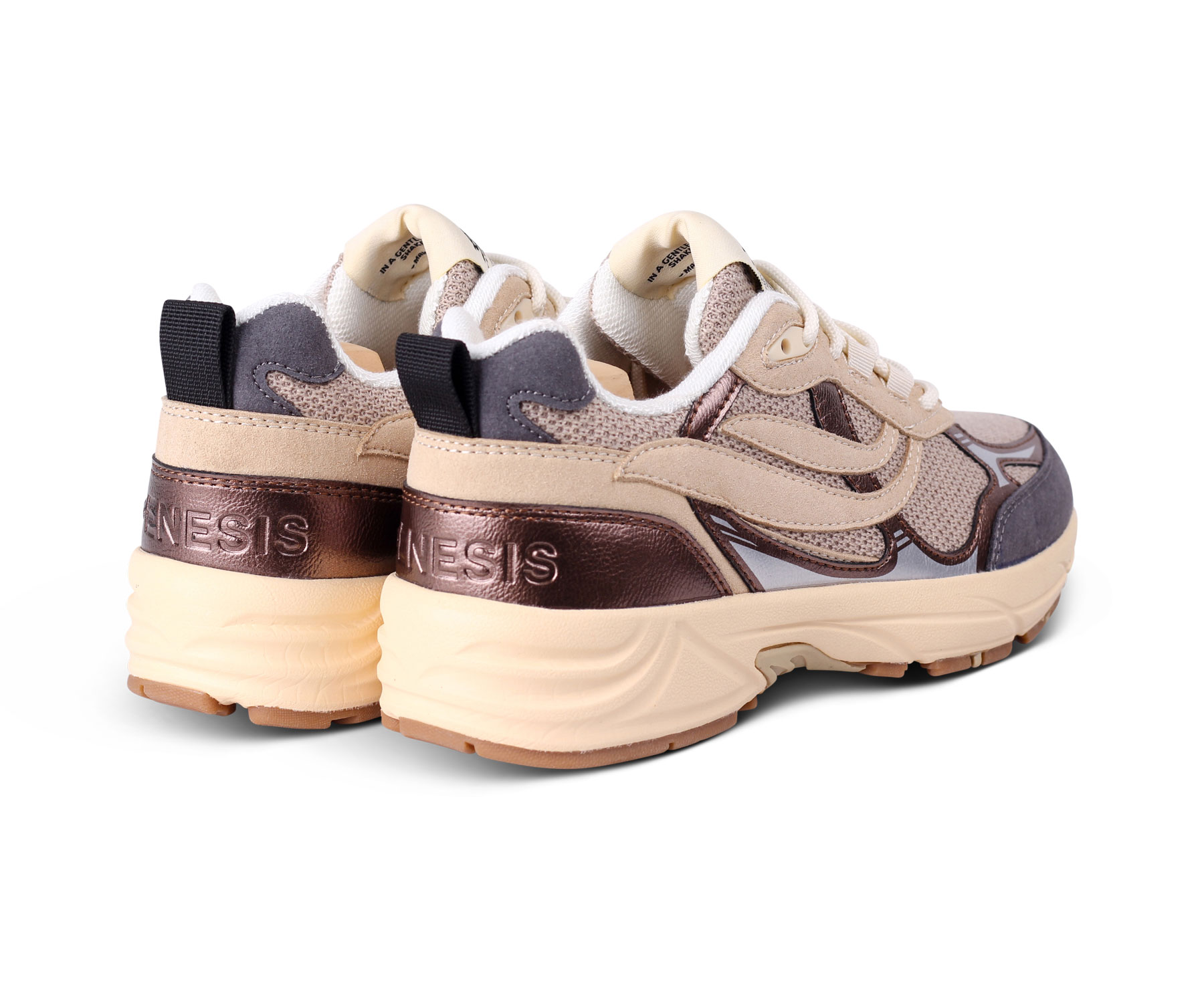 Beim G-ECO’99 Metallic setzen wir auf innovative, ressourcenschonende Materialien wie veganes Leder aus Maisabfällen und CONTRA MESH – ein robustes Mesh-Gewebe aus 100 % recycelten PET-Flaschen. Die Innensohle mit unserer Cork’in™ Technologie kombiniert recycelten PU-Schaum mit FSC-zertifiziertem Kork und sorgt für natürlichen Tragekomfort und Atmungsaktivität.