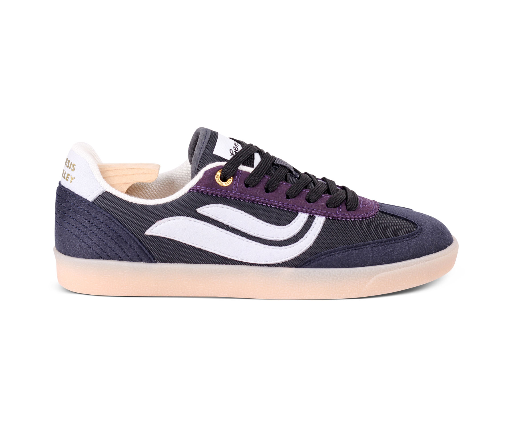 Obermaterial & Logo: BIOWAVE™ vegan Wildleder aus Zuckerrohr + recyceltem PET-Mesh aus 100 % recycelten PET-Flaschen