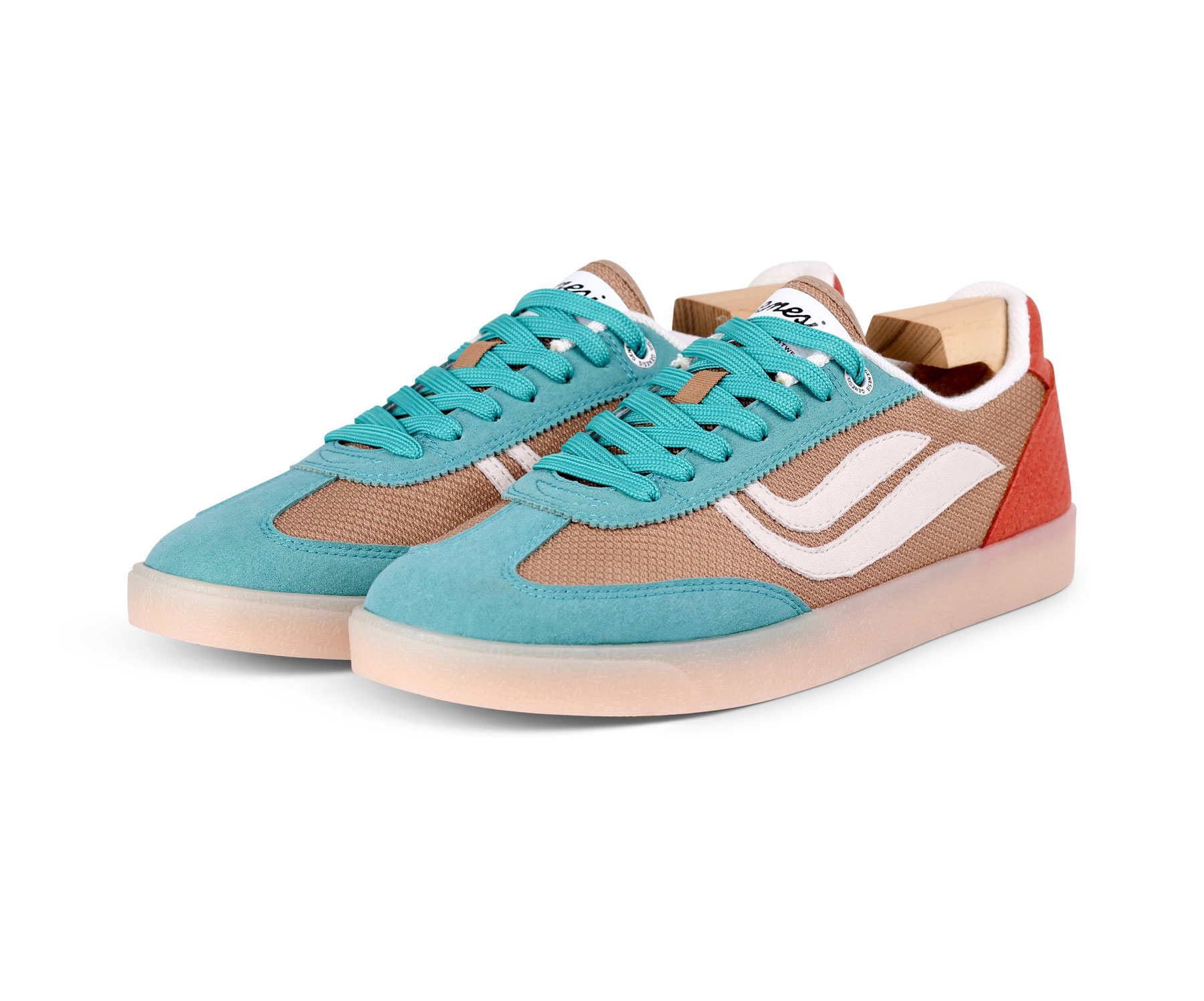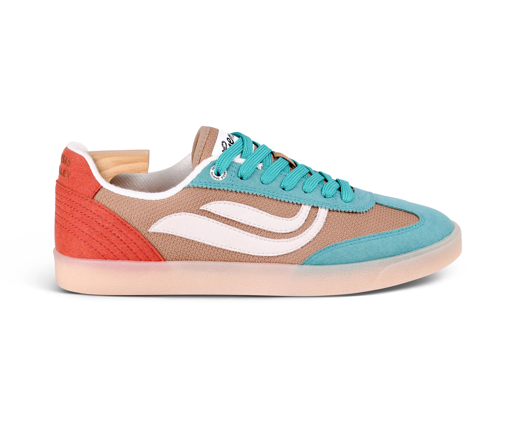 Obermaterial & Logo: BIOWAVE™ vegan Wildleder aus Zuckerrohr + recyceltem PET-Mesh aus 100 % recycelten PET-Flaschen