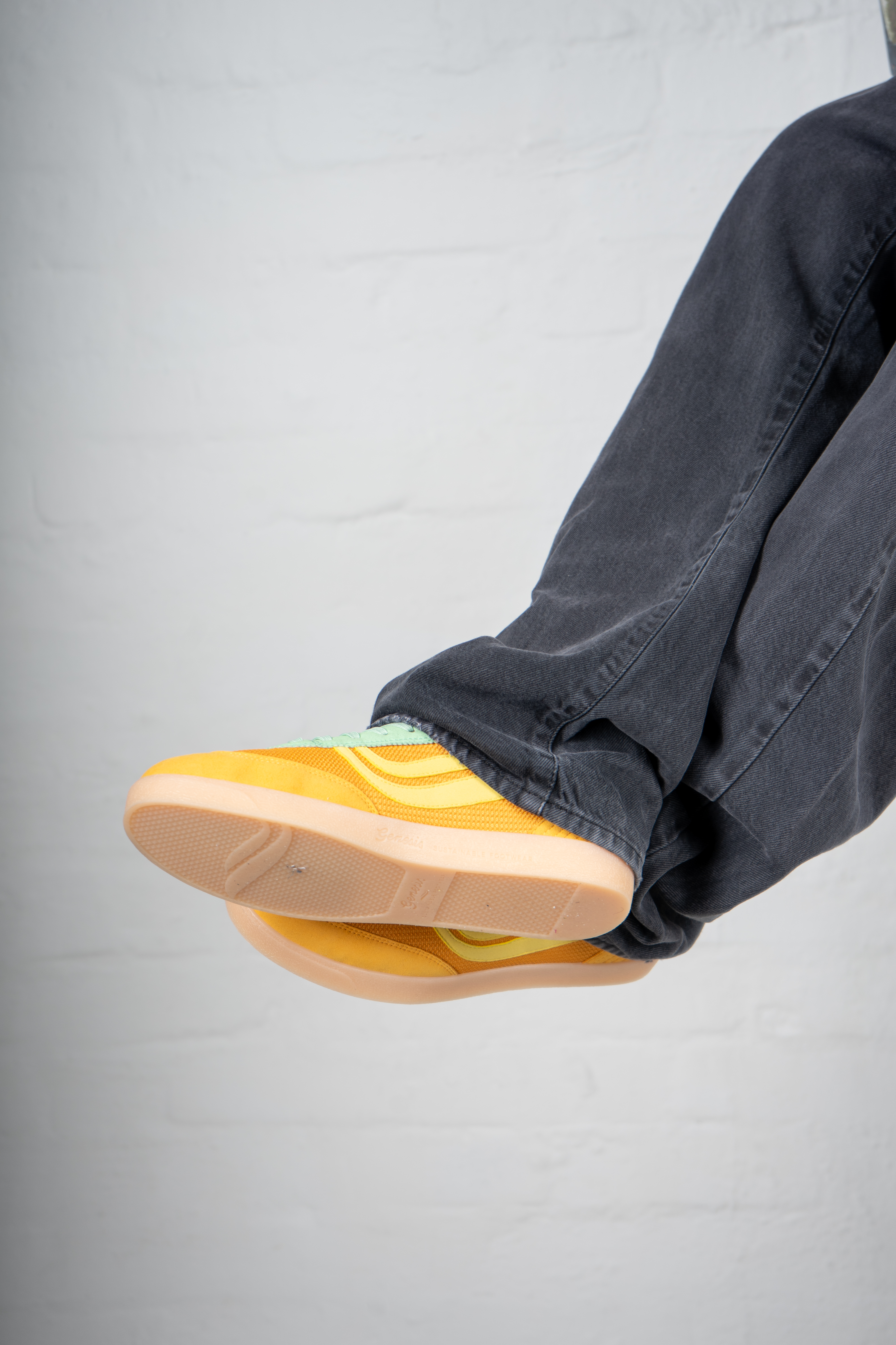 Der G-Volley Mesh kombiniert klassisches Court-Design mit modernen, nachhaltigen Materialien. Das Obermaterial aus Cornwaste, einem veganen Veloursleder aus Maisabfällen, wird mit leichtem, atmungsaktivem Mesh aus 100 % recycelten PET-Flaschen ergänzt. Diese Kombination sorgt für eine ausgewogene Mischung aus Stabilität, Komfort und Luftdurchlässigkeit.